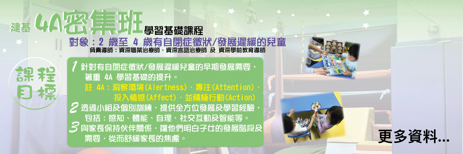 透過專業的團隊為有需要兒童服務,最主要為自閉症、發展遲緩、言語遲緩。提供密集班、ABA 密集式課程、言語治療、職業治療、臨床心理學家評估、感覺統合訓練、社交溝通技巧訓練及到校支援服務等。